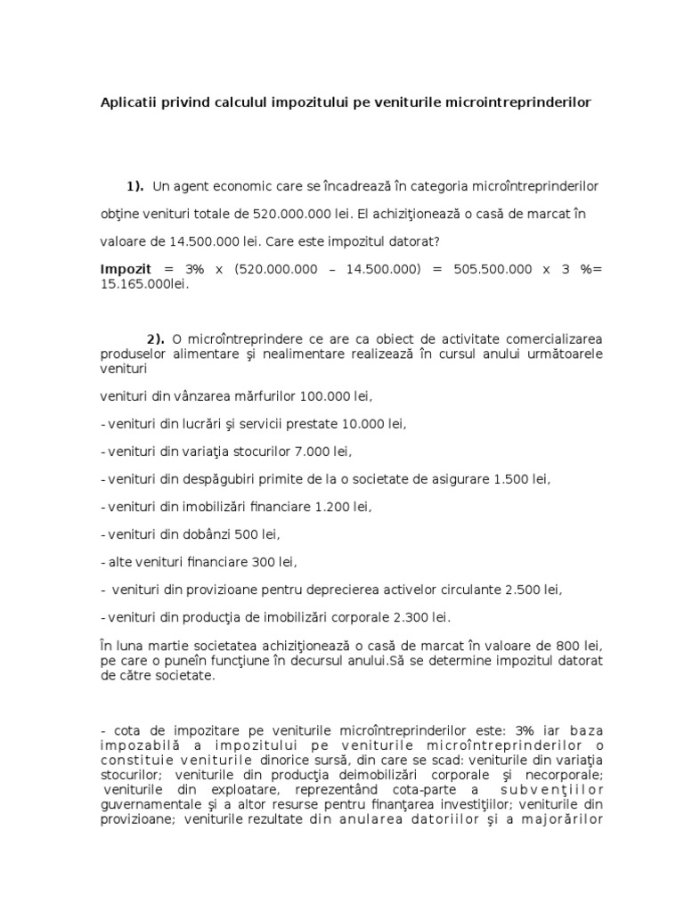 Deși este unul dintre cele mai ușor de calculat impozite impozitul pe veniturile microintreprinderilor necesită la rândul lui atenție există posibilitatea de a se strecura erori sau omisiuni atunci când se determină baza de calcul. 1 pentru microintreprinderile care au unul sau mai multi salariati. Avand in vedere ca ordonanta nu impune restrictii in acest sens in cazul mentionat de dvs apreciez ca ar trebui sa intocmiti un op distinct in care sa mentionati impozitul pe veniturile. Pentru determinarea impozitului pe veniturile microintreprinderilor la baza impozabila determinata potrivit alin.