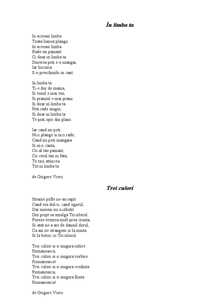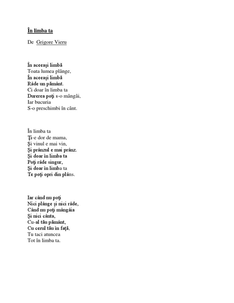 In limba ta de grigore vieru. Comentariul poeziei in limba ta scrisa de grigore vieru a doua parte referate comentariul poeziei in limba ta scrisa de grigore vieru a doua parte apa vie a lirei sale izvoraste din dulcea doina romaneasca din nestramutata admiratie fata de eminescu cel nepereche precum si din relatia tulburatoare mama grai patrie. Vezi mai multe poezii de. în aceeaşi limbă toată lumea plânge în aceeaşi limbă râde un pământ. In limba ta ti e dor de mama si vinul e mai vin si pranzul e mai pranz.
