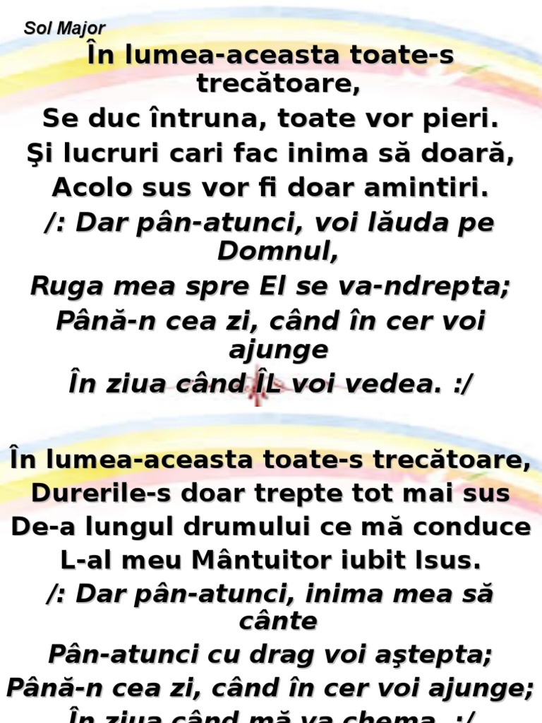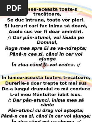 In lumea aceasta toate s trecatoare. Pâna atunci cu drag voi astepta pâna n cea zi când în cer voi ajunge în ziua când ma va chema. în lumea ceasta toate s trecatoare. Pe site găsiți 9501 cântări versuri creștine cu tematica copii colinde an nou cină nuntă paști tineret diverse și cărți de cântari. în lumea aceasta toate s trecătoare.