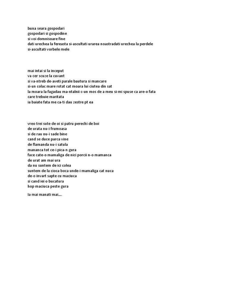 Seara lui sfântu vasile să vă fie gospodari de bine şi nouă de folos că suntem plugari de jos. O nsarat o nourat noi plugari ne am adunat de prin dealuri de prin văi tot plugari de alde noi.