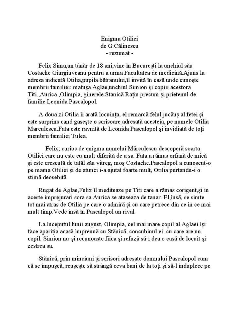 Acesta se aseaza pe locul lui de langa. Educatia gresita din unele familii burgheze. Universitar şi secăsătoreşte bine intrând în cercuri înalte se întâlneşte întâmplător cu pascalopol pe tren şi află că acesta a divorţatde otilia fiind acum căsătorită cu un om bogat din buenos aires. Mi ar fi plăcut totuși să regăsesc mai multă acțiune în carte.