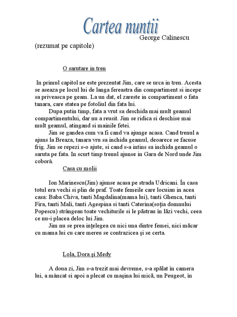 In tren de george calinescu rezumat. Cartea nuntii george calinescu rezumat cartea nuntii george calinescu cartea nuntii george calinescu rezumat cartea nuntii de george calinescu actiunea romanului incepe intr un tren in care tanarul jim peronajul principal al romanului se intorcea acasa de la studii din strainatate. Si în prozele scurte comicul este bi 2 camil petrescu patul lui procust in tren de george calinescu rezumat pe scurt tren cu fred vasilescu si noua sa amanta. Rezumat la celebrul roman enigma otiliei in care este vorba despre un tânăr de 18 ani pe nume felix sima care vine în bucurești la unchiul său costache giurgiuveanu pentru a urma facultatea de medicină. Felix ajunge la adresa pe care o avea si o cunoaște pe otilia.