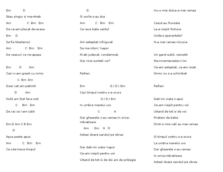 In umbra marelui urs tabulatura. Em caci timpul nostru s a scurs g d em in umbra marelui urs g d em dar ghearele v au r c amas in orice mb a ratisare astazi d g oare sa d rutul pe ob em raz dar dati mi viata napoi g d em ce am risipit pentru voi g d em uitand de tot si de d c oi ani de pribe a gie inc o c mie dulce a mai ra a mas. E a c d am em g chords for nicu covaci in umbra marelui urss with capo transposer play along with guitar piano ukulele mandolin. Get access to pro version of in umbra marelui urs. Chorus em g d em caci timpul nostru s a scurs g d em in umbra marelui urs c a dar ghearele v au ramas in orice mbratisare g d em astazi doare sarutul pe obraz g d em dar dati mi viata napoi g d em ce am risipit pentru voi c a uitand de tot si de doi ani de pribegie c a inc o mie dulce a mai ramas bridge.