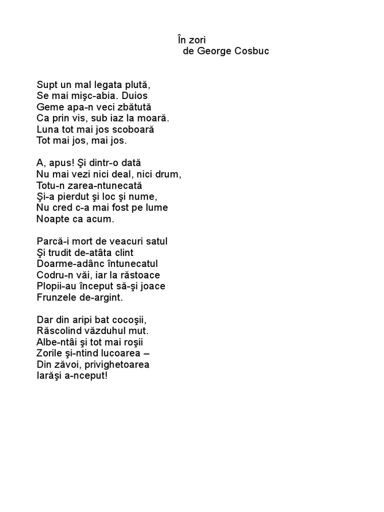 In zori de george cosbuc. George cosbuc în zori supt un mal legata pluta se mai misc abia. Poezia în zori de george coșbuc este un pastel deoarece autorul își exprimă în mod direct și discret sentimentele impresiile la vederea unui peisaj din natură descris în primele momente ale zilei în zori prin intermediul limbajului artistic titlul poeziei un complement de timp poate fi și o metaforă pentru noțiunea de timp al luminii de început de parcă natura a. Supt un mal legata plută se mai mişc abia. Poezia în zori de george coșbuc a fost publicată în anul 1902 în volumul intitulat ziarul unui pierde vară.