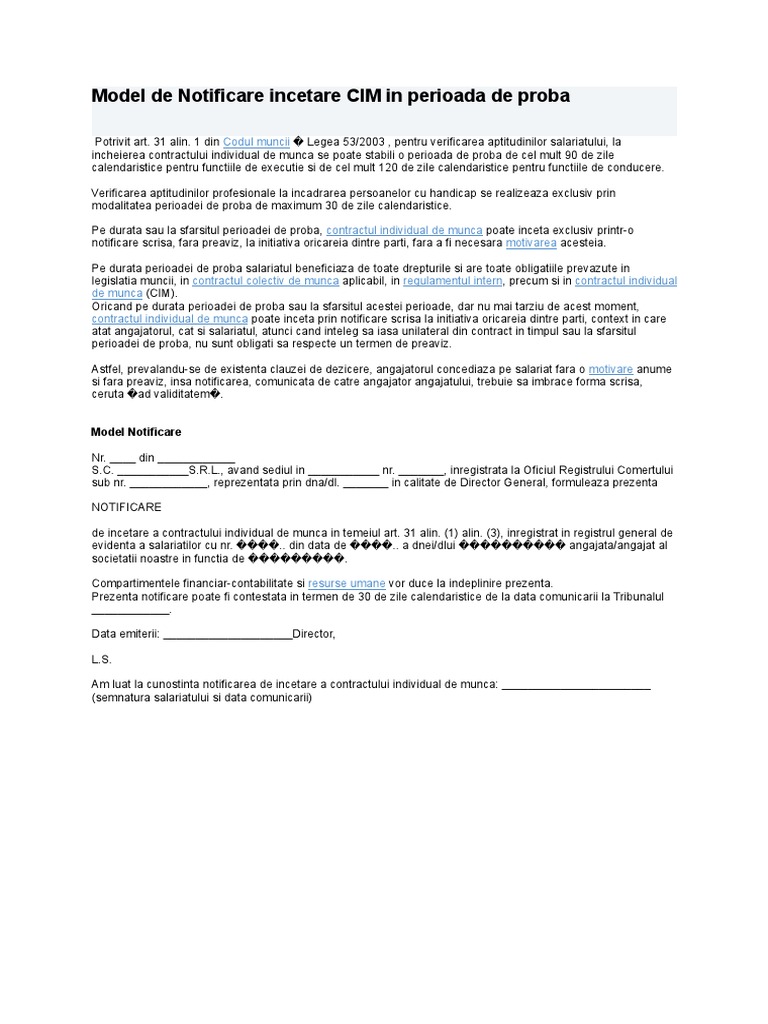 Una din modalitatile prin care contractul individual de munca poate inceta este incetarea in timpul perioadei de proba iar articolul folosit drept temei legal este art. Perioada de proba 1 pentru verificarea aptitudinilor salariatului la incheierea contractului individual de munca se poate stabili o perioada de proba de cel mult 90 de zile calendaristice pentru functiile de executie si de cel mult 120 de zile calendaristice pentru functiile de conducere. In general la o singura firma exista o singura perioada de proba. Model de notificare incetare cim in perioada de proba potrivit art.