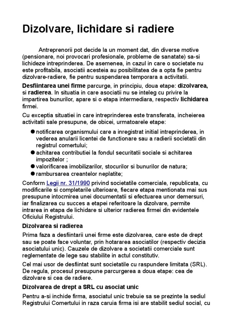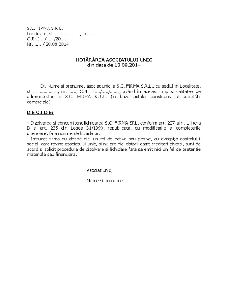 A cest ghid contine toti pasii ce trebuie urmati pentru infiintarea unei firme in 2019 mai exact a unei societati comerciale cu raspundere limitata s r l cu asociat unic. Dizolvarea unei firme simple mici care nu are active pe ea se face in doua etape. Modele orientative pentru documentele necesare la distribuirea dividendelor. Decizie asociat unic aspecte teoretice titlul iv modificarea actului constitutiv capitolul i dispoziţii generale art.
