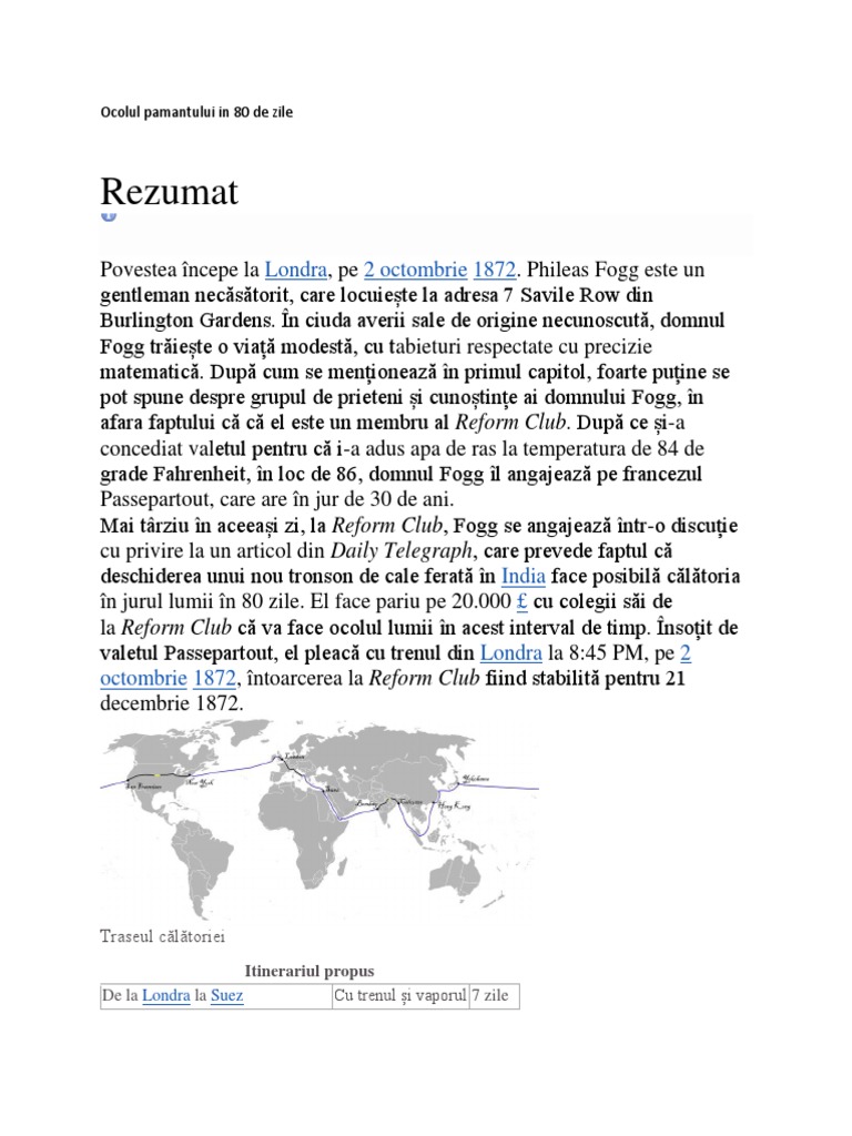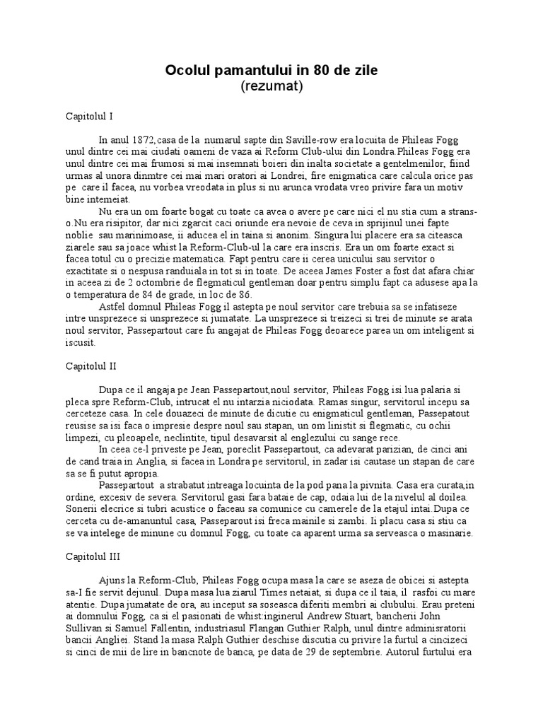 Exploratorul portughez fernando magellan 1480 1521 a pornit din spania în anul 1519 cu o flotă de doar cinci corăbii pentru a găsi un traseu maritim prin vest către insulele mirodeniilor. Asa ca au mers sa i cumpere haine. Phileas fogg este un gentleman necăsătorit care locuieşte la numarul 7 savile row din burlington gardens. Ocolul pământului în optzeci de zile rezumat de jules verne septembrie 30 2015 septembrie 30 2015 horia texte jules verne ocolul pământului în optzeci de zile rezumat în această carte este vorba despre o extraordinară călătorie în jurul lumii realizată în timp record de către un gentleman pe nume phileas foog.
