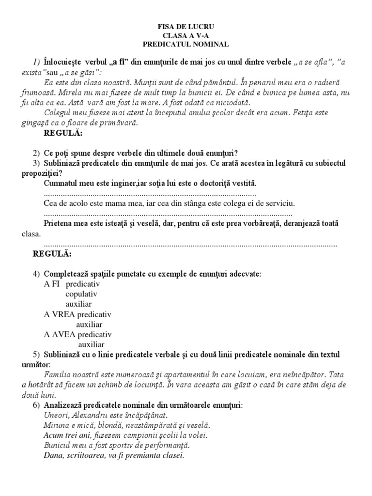 Indicati felul predicatelor din textul urmator. 7 si s asaza toti la masa cum li s anii. Precizati functia sintactica si cazul cuvintelor din enuntul. Identificati predicatele nominale din enunturile de mai jos si aratati prin ce parti de vorbire se exprima. A venit serios la noi sa facem la matematica descompunerea multimilor am tras la sorti si a iesit taica su dupa o ora si ceva l am pacalit sa ne jucam.