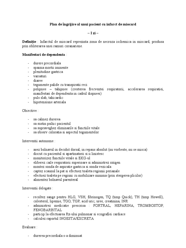 Infarct miocardic acut plan de ingrijire. Discut cu bolnavul si il incurajez il pun in legatura cu alti bolnavi care au facut infarct de miocard acut si s au vindecat masor si notez functiile vitale schimb pozitia bolnavului in pat efectuez toaleta pe regiuni pensez sonda gastrica 6 ore si alimentez bolnavul per os cu ceai lapte supa strecurata 100 150 ml. Ingrijirea pacientului cu infarct miocardic. Bolnavul trebuie sa duca o viata. 90 95 dintre cazurile de ima sunt produse de ateroscleroza coronariana.