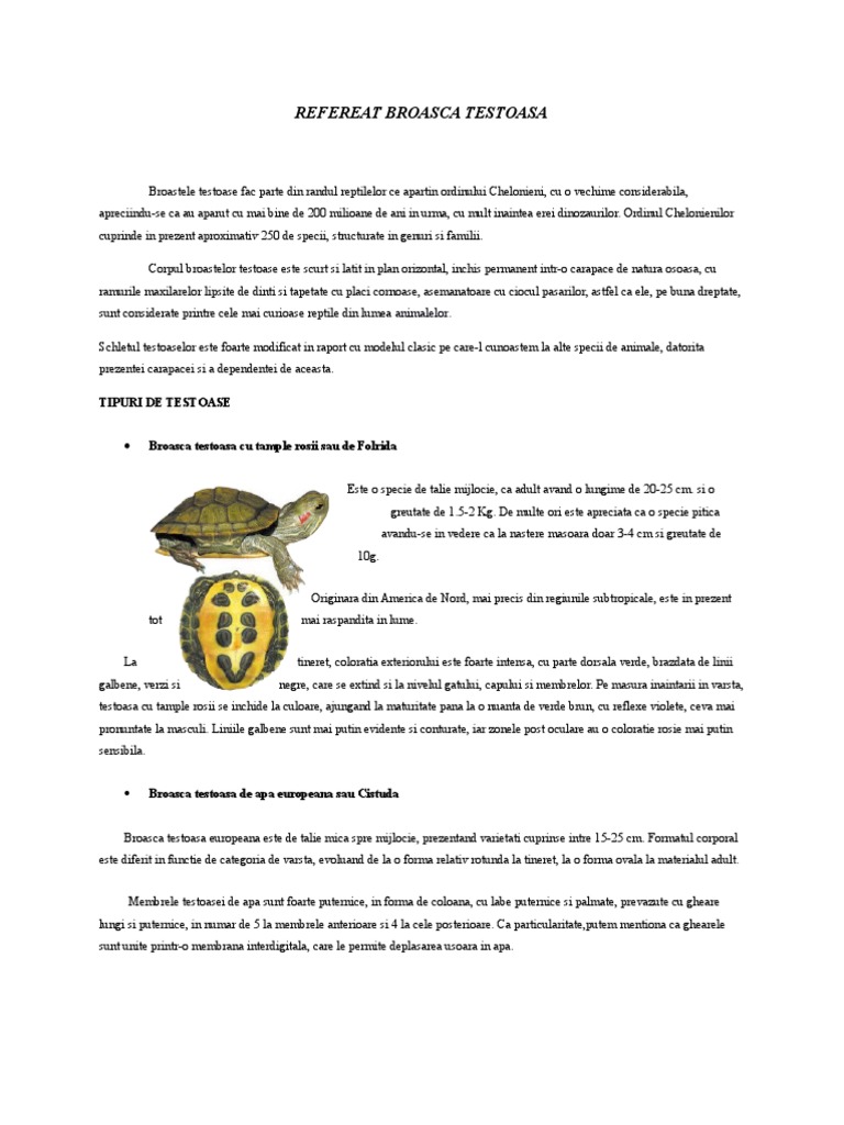 Cea mai grea broască ţestoasă din lume la ora actuală este broasca ţestoasă pieloasă luthul dermochelys coriaceea ce are o greutate de 700 kg şi o lungime de 2 3 m. Singura țestoasă autohtonă din parcul natural văcărești este îndrăgită de observatorii de toate vârstele care la vederea ei exclamă de cele mai multe ori. La nivel global exista in jur de 300 de specii de testoase impartite in trei categorii principale. La mascul carapacea are 14 17 cm iar coada 6 9 cm iar carapacea la femela are 14 18 cm coada 6 8 cm.