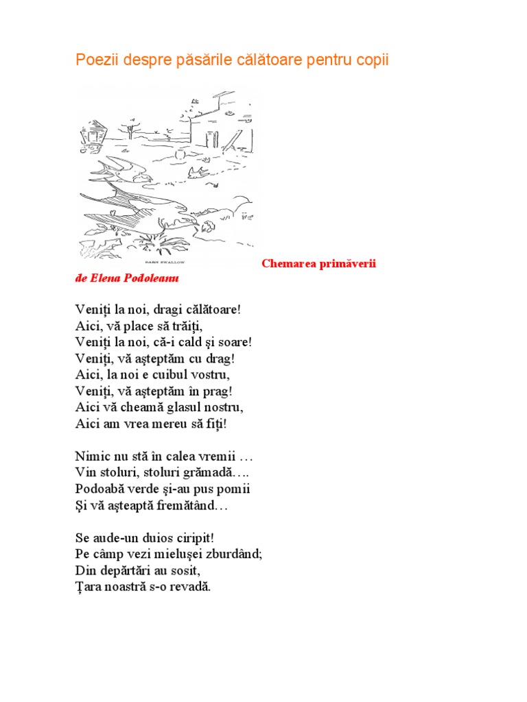 Informatii despre pasari calatoare pentru copii. Bufniţa vine doctoru n pădure cu fes roş şi secure. înaltă cu lungi picioare pene negre pe aripi are. Ciocârlia este o pasare cântătoare mica cu penele pestrite care zboara la mari înaltimi. Corbii sunt imitatori grozavi ai sunetelor și discursului uman.