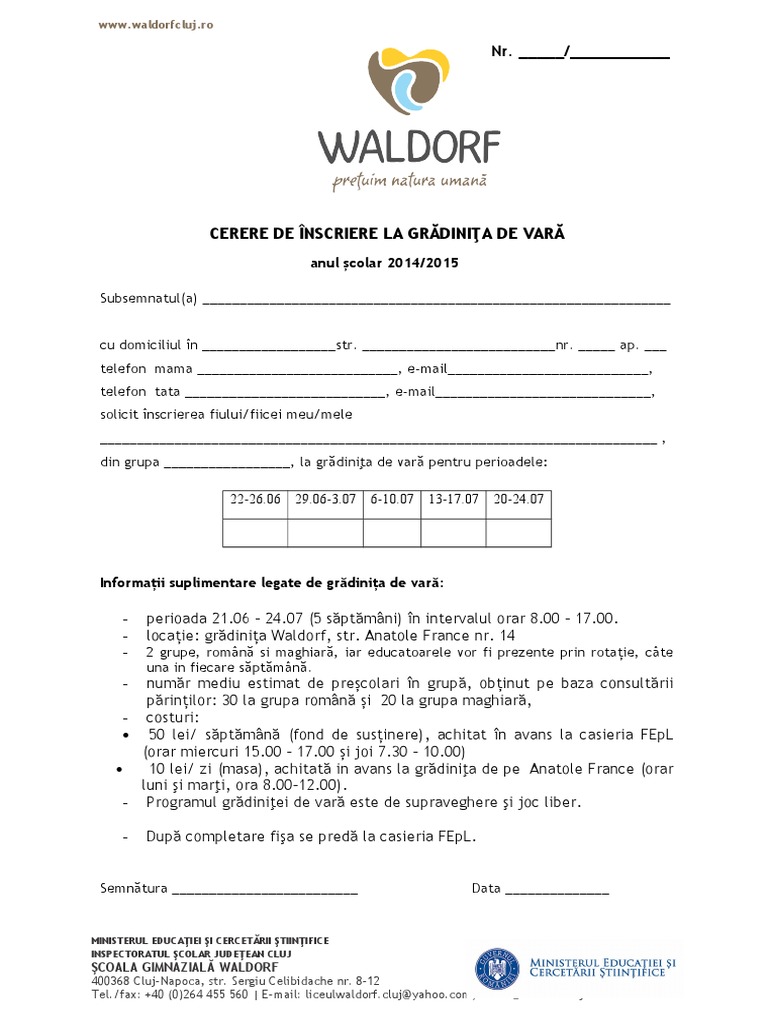 înregistrarea nu presupune niciun cost în sarcina părinților iar printre actele necesare se numără și. Ministerul educatiei anunta ca reinscrierea copiilor la gradinita se va desfasura in perioada 25 mai 5 iunie iar inscrierea se va face in doua etape intre 8 iunie 3 iulie si 20 iulie 10 august. Reinscrierea copiilor care frecventeaza gradinita in acest an scolar si doresc sa o frecventeze si in anul scolar 2017 2018 respectiv inscrierea copiilor nou veniti. Cand incepe inscrierea la gradinite.
