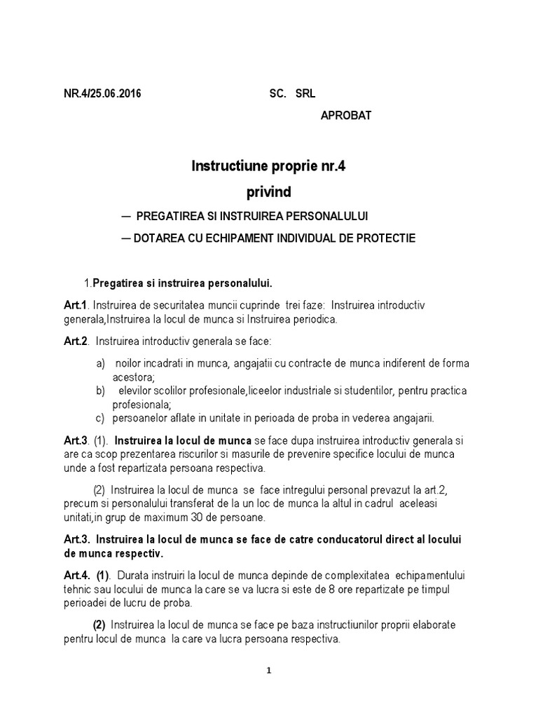 Participantii la instruire 1 instruirea la locul de munca se face dupa instruirea introductiv generala si are ca scop prezentarea riscurilor pentru securitate si sanatate in munca precum si masurile si activitatile de prevenire si protectie la nivelul fiecarui loc de munca post de lucru si sau fiecarei functii exercitate. 90 reviste 1 1 instruirea la locul de muncă se face după instruirea introductiv generală și are ca scop prezentarea riscurilor pentru securitate și sănătate în muncă precum și măsurile și activitățile de prevenire și protecție la nivelul. Instruirea la locul de muncă se face de către conducătorul direct al locului de muncă în grupe de maximum 20 de persoane. Durata instruirii la locul de muncă depinde de riscurile pentru securitate şi sănătate în muncă precum şi de măsurile şi activităţile de prevenire şi protecţie la nivelul fiecărui loc de muncă post de lucru şi sau fiecărei funcţii exercitate.