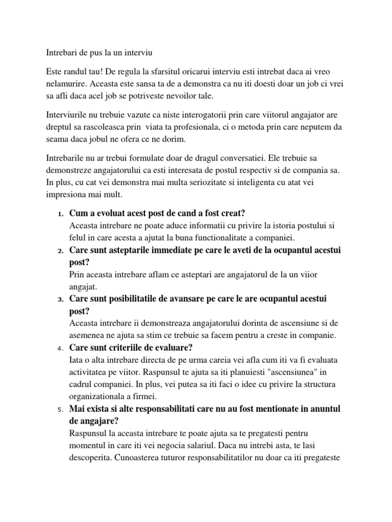 50 de intrebari pe care le poti pune angajatorului la interviu timp de citire. Tuturor ne place să vedem că interlocutorul nostru este interesat de noi. Job expert sapte intrebari cheie de pus angajatorului la interviu marti 03 decembrie 2013 ora 07 01 angajatorul nu este singurul care poate adresa intrebari in cadrul interviului de recrutare. După mai multe experiențe de genul ăsta mi am dat seama totuși că ar trebui să întreb ceva chiar dacă nu mai am de fapt nicio curiozitate.
