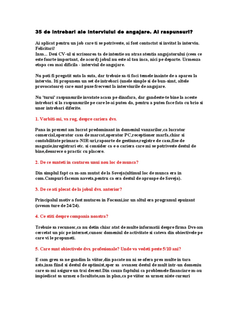 Intrebari si raspunsuri la interviu. Vezi care este strategia pe care o poti aplica la fiecare intrebare a angajatorului. Contează să ai la îndemână întrebările potrivite pentru a afla aceste informații. Noiembrie 25 2016 noiembrie 28 2016 interviuangajare lasă un comentariu. Vorbeste mi despre tinetrebuie sa ai un discurs deja pregatit in minte.