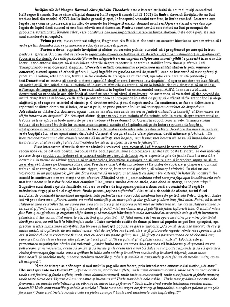 Scrise catre sfarsitul domniei lui neagoe basarab 1512 l521 in limba slavona invataturile au fost traduse inca din secolul al xvi lea in limba greaca si apoi la inceputul veacului urmator in limba romana a vazut pentru prima data lumina tiparului in 1843 prin grija fratelui loan ecleziarhul curtii din bucuresti. Hasdeu falnic monument de literatura politica filozofie si elocinta la strabunicii nostri scrisa in spiritul renasterii este o carte de invatatura un manual de educatie morala si politica si in acelasi timp un testament pentru urmasi cuprinzand sfaturi maxime si invataturi ale. Pare corect dar lipsa argumentelor concrete trebuie să ne dea de gândit.