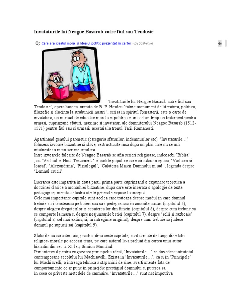 Așa am învățat la școală. Lucrare parenetica atribuita de cei mai multi cercetatori lui neagoe basarab. Galerie foto 1 societate. Personalitatea complexă a lui neagoe basarab a lăsat posterităţii două monumente de o valoare excepţională unul în domeniul arhitecturii măreaţa biserică episcopală de la curtea de argeş iar altul în domeniul literaturii învăţăturile către fiul său teodosie neagoe basarab şi a petrecut tinereţea în anturajul patriarhului nifon şi la mănăstirea bistriţa.