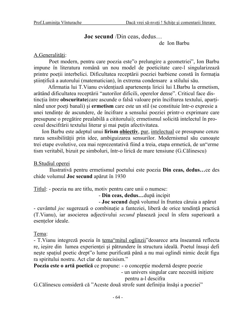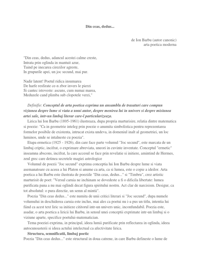 Ion barbu joc secund comentariu. Ipoteza volumul joc secund publicat în 1930 se deschide cu poezia din ceas dedus al cărui titlu este înlocuit de editori în 1964 cu titlul volumului poezia are caracter de artă poetică şi aparţine modernismului barbian. Joc secund de ion barbu face parte din seria artelor poetice modern interbelice alaturi de testament de tudor arghezi si eu nu strivesc corola de minuni a lumii de lucian blaga. Ca matematician acesta s a impus prin spatiile barbiliene. Joc secund de ion barbu face parte din seria artelor poetice modern interbelice alaturi de testament de tudor arghezi si eu nu strivesc corola de minuni a lumii de lucian blaga.