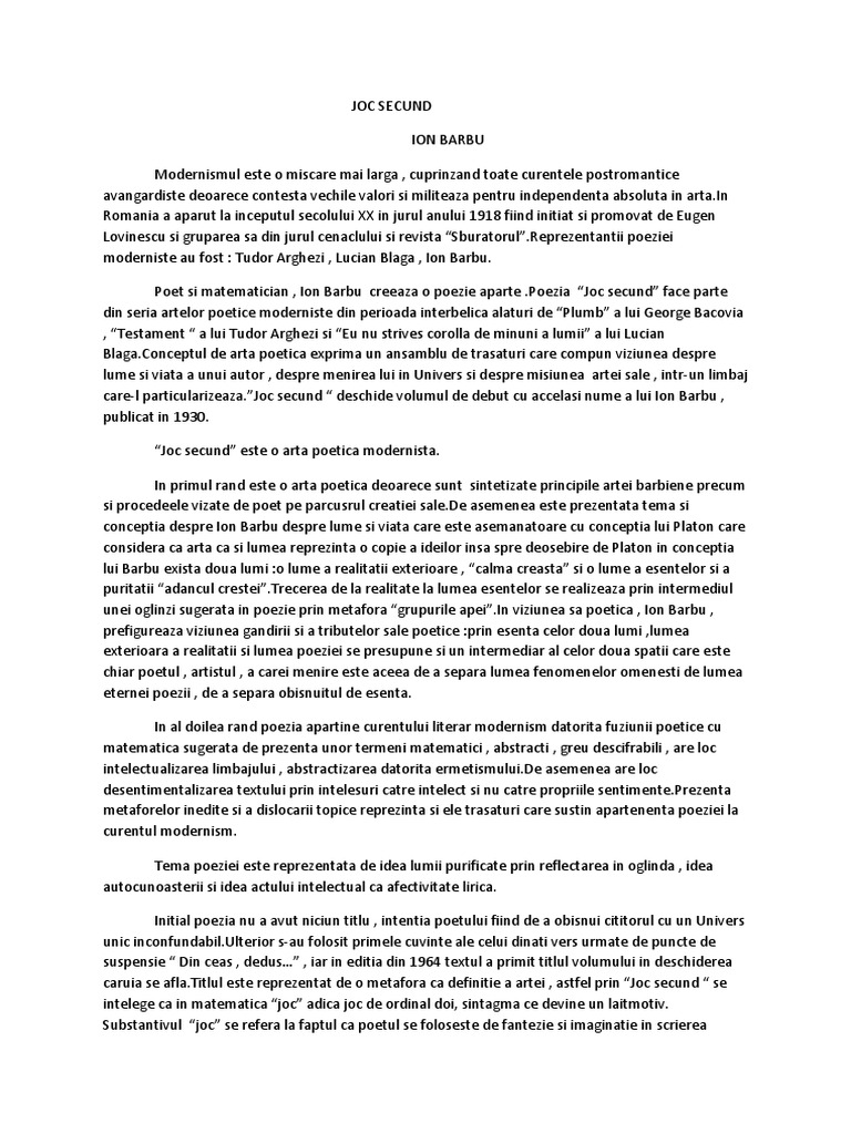Ion barbu joc secund comentariu redacteaza un eseu in care sa prezinti o arta poetica modernista. Este un reprezentant stralucit al modernismului poet interbelic. De ion barbu ion barbu 2002 07 05 înscris în bibliotecă de radu herinean. Joc secund de ion barbu text poetic tema și viziunea.