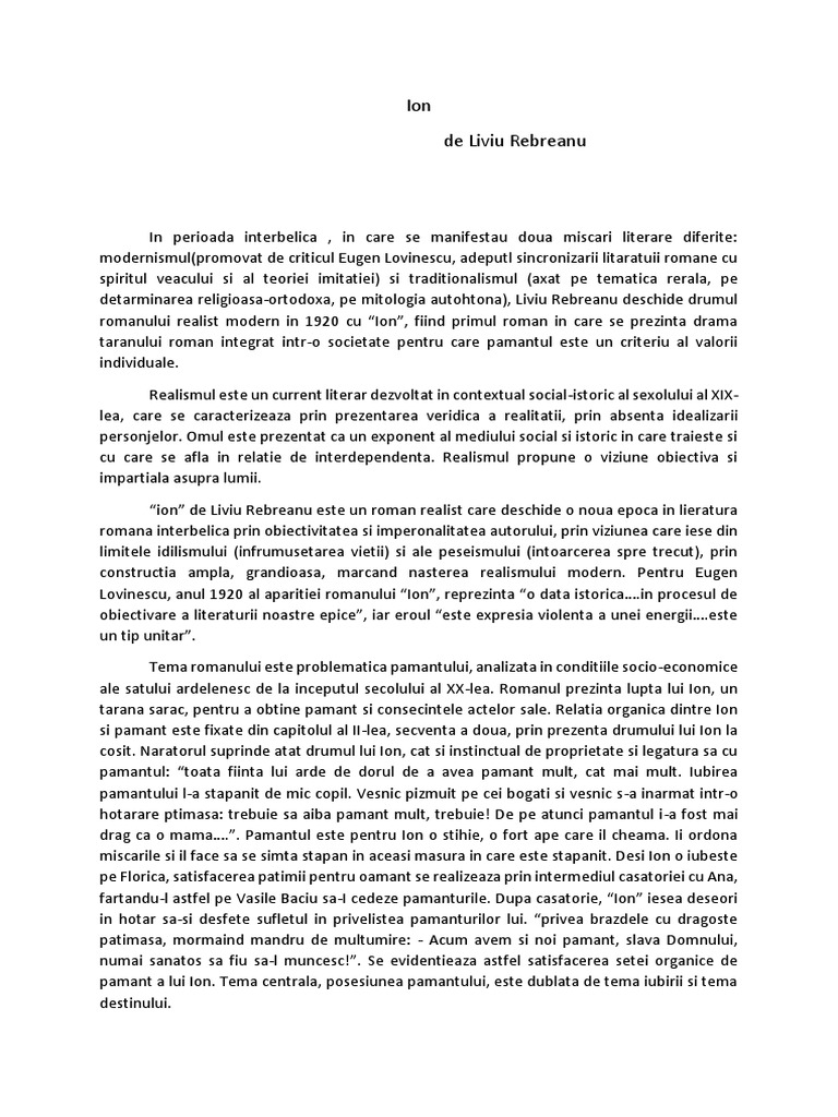 Ion de liviu rebreanu eseu bac. In romanul ion ana va fi personajul care va avea un destin tragic. Ion de liviu rebreanu eseu. Definirea romanului romanul este specia literara a genului epic in proza de mare intindere cu personaje numeroase complexe si amplu caracterizare cu o intriga complicata si actiune ampla. Textul suport ion de liviu rebreanu material realizat de prof.