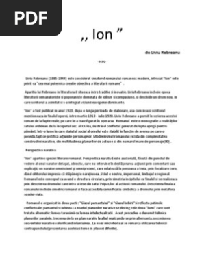 La baza operei stau doua aspecte. Ion a fost publicat in anul 1920 dupa o lunga perioada de elaborare asa cum insusi scriitorul mentioneaza in finalul operei intre martie 1913 iulie 1920. Este prozator interbelic creator al romanului realist obiectiv în literatura română. în elaborarea eseului vei avea în vedere următoarele repere.