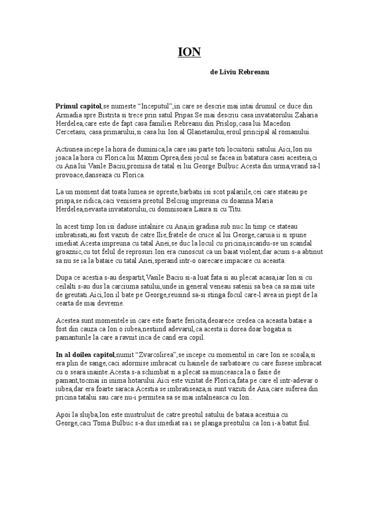 Ion este primul roman obiectiv din literatura română fiind apărut în anul 1920 după o lungă. Ion o iubea pe florica dar ea era saraca iar ana avea pamanturi de la carciuma se intoarce ilie onu care l vede cu fata acesta era frate de cruce cu george al tomii. In art and culture. Ion este un roman social scris de liviu rebreanu și apărut în anul 1920.