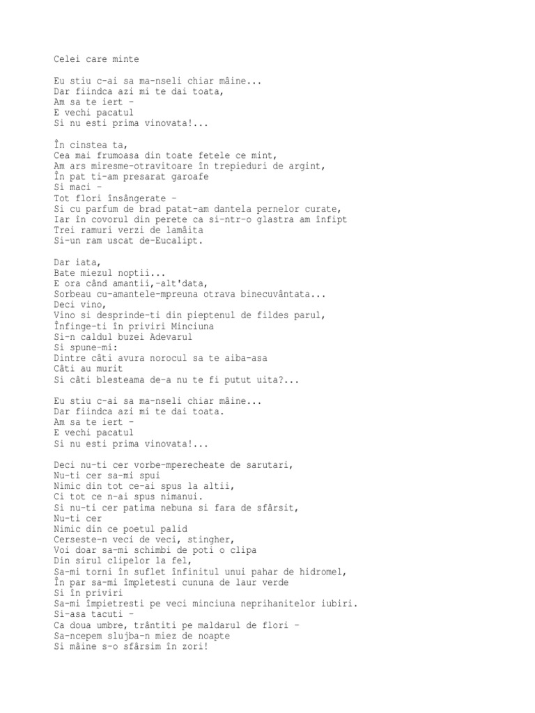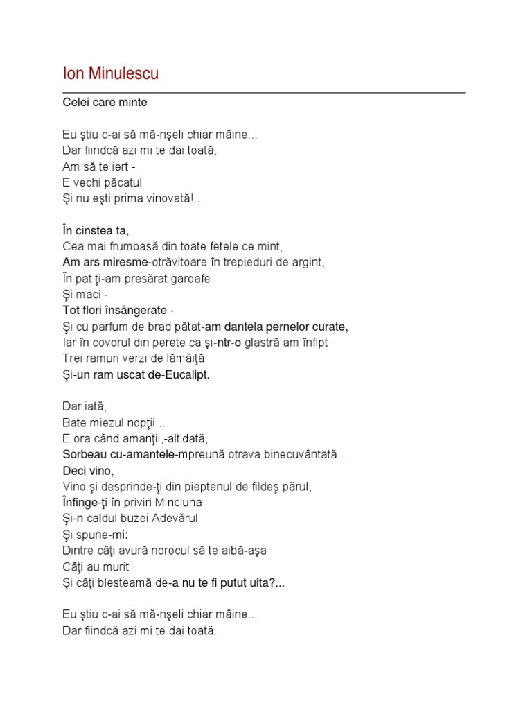 Celei care minte versuri ion minulescu versuri ro versuri i io ion minulescu celei care minte. Celei care minte de ion minulescu. Eu stiu c ai sa ma nseli chiar maine. Celei care minte de ion minulescu et fais moi des serments que tu rompras demain paul verlaine eu știu c ai să mă nșeli chiar mâine.