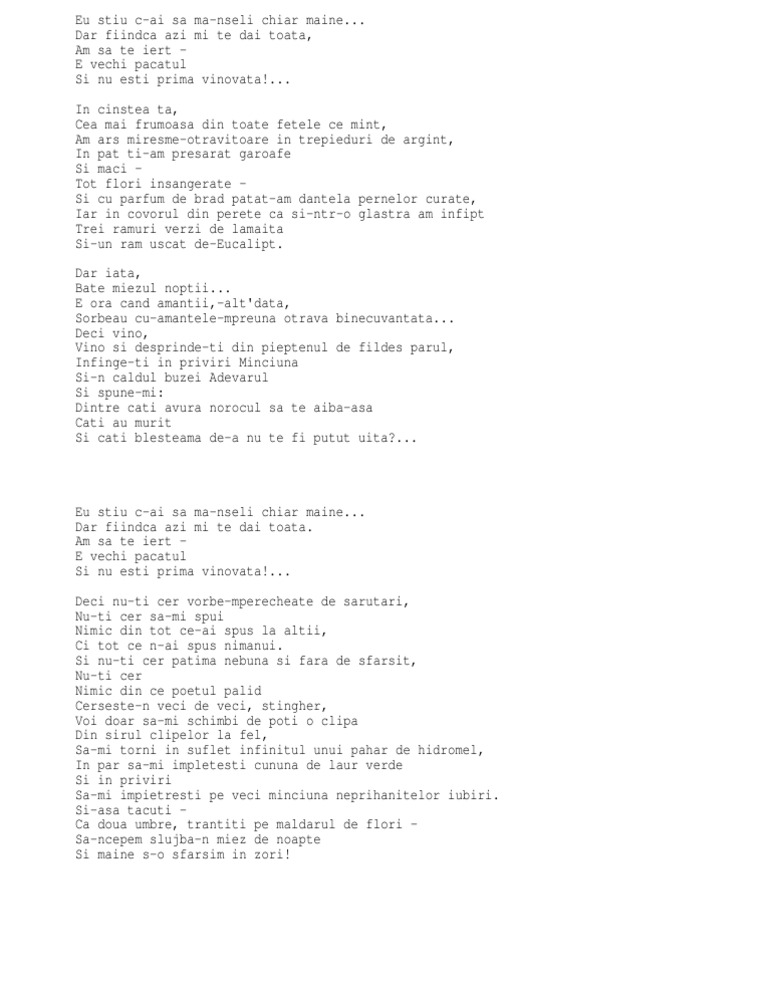 Eu ştiu c ai să mă nşeli chiar mâine. Eu ştiu c ai să mă nşeli chiar mâine dar fiindcă azi mi te dai toată am să te iert e vechi păcatul şi nu eşti prima vinovată în cinstea ta cea mai frumoasă din toate fetele ce mint am ars miresme otrăvitoare în trepieduri de argint în pat ţi am presărat garoafe şi maci. Celei care minte eu ştiu c ai să mă nşeli chiar mâine. Celei care minte ion minulescu.