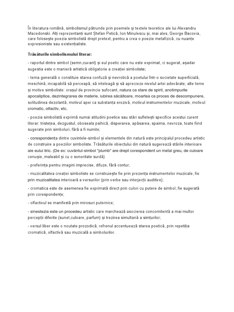 Ion minulescu poezii simboliste. în 1897 îi apar primele poezii în revista povestea vorbei de la piteşti unde este elev. Cromatica este restrânsă pe câteva motive tipic simboliste. Tristeţea nevroza moartea culorile dominante în universului bacovian fiind albul şi negrul din a căror opoziţie rezultă decorul îndoliat al scenei universale pe care joacă destinul fragil şi părelnic şi coloratele feţe ale lucrurilor cele doua culori formand prin combinare o nuanta de gri culoare ce exprima. Primele idei care prefigurează simbolismul la români și care.