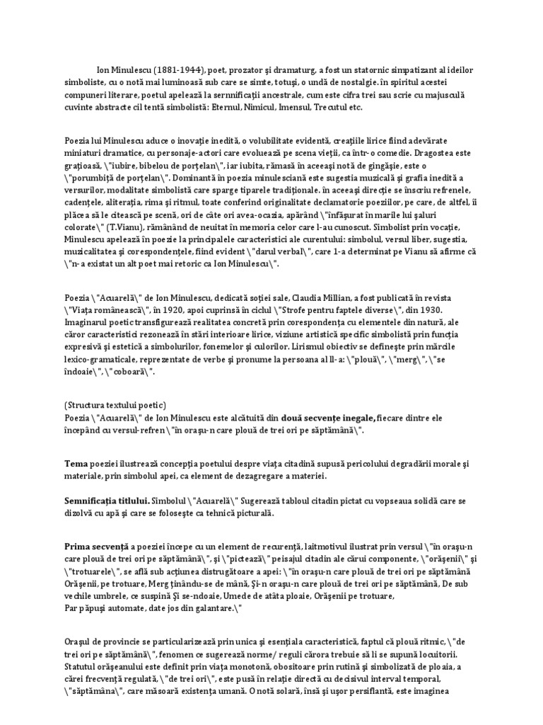 11 aprilie 1944 bucurești a fost un poet și prozator român reprezentant important al simbolismului românesc ion minulescu este numit director general al artelor în 1922. în 1898 sub pseudonimul i m. Ion minulescu a cultivat in scrierile sale motive tipic simboliste incadrandu se cu succes in acest gen in poeziile sale aparand teme precum mirajul locurilor exotice pe care le a colindat de a lungul vietii indeosebi marea ca si aspiratie spre absolut stari sufletesti indescifrabile erotism sau moarte expuse intr un limbaj alegoric. Eugen lovinescu poeti simbolisti ion minulescu adevaratul stegar al miscarii simboliste a fost i.