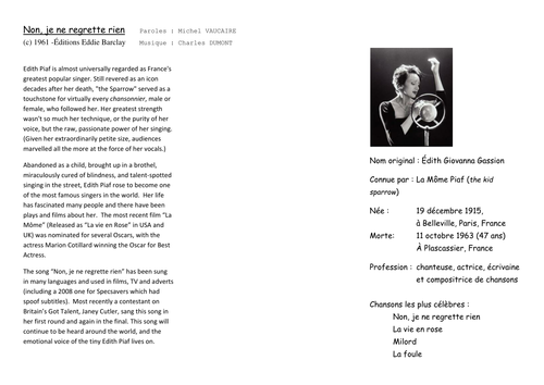 Je ne regrette rien lyrics. Become a better singer in only 30 days with easy video lessons. Non rien de rien br no nothing of nothing br non je ne regrette rien br no i don t feel sorry br about nothing br ni le bien qu on m a fait br not the good things people have done to me br ni le mal tout ã a m est bien ã gal br not the bad things it s all the same to me br non rien de. Non je ne regrette rien no regrets is a famous edith piaf song that was featured in the movie inception as the song that triggered the heroes to exit a dream. Comment and share your favourite lyrics.