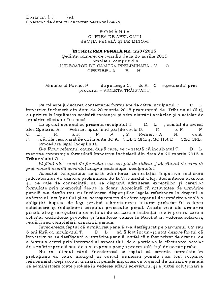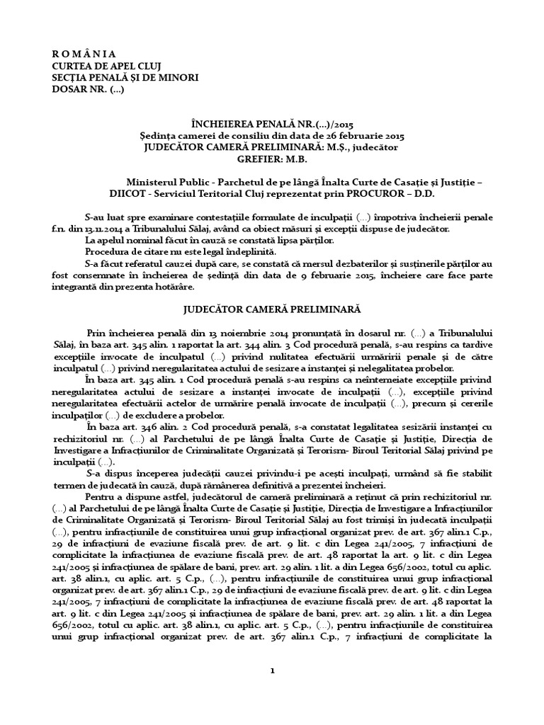 Ca sa fiu mai specific este vorba de un grup de mai multe persoane din care. 2 in cauzele in care fata de inculpat s a dispus o masura preventiva judecatorul de camera preliminara verifica legalitatea si temeinicia masurii preventive procedand potrivit dispozitiilor art. 663 din 11 noiembrie 2014 paragraful 18 prin care s a statuat în ce priveşte critica referitoare la posibilitatea judecătorului de cameră preliminară care s a pronunţat asupra soluţiilor de netrimitere în judecată ori asupra obiectului procedurii camerei preliminare să exercite şi funcţia de. 1 judecatorul de camera preliminara hotaraste prin incheiere motivata in camera de consiliu fara participarea inculpatului si a procurorului.
