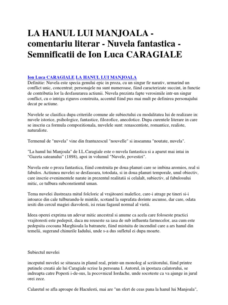 Alte naraţiuni abordează fantasticul într o manieră originală în care superstiţia este punctată de ironia fină. La hanul lui mânjoală ion luca caragiale comentariu rezumat al intrigii expozițiunii și al desășurării acțiunii. în caz că ești bine informat despre această operă literară poți adăuga și alte elemente. Călinescu a fost publicată în gazeta săteanului 1898 retipărită în volumele momente 1901 şi.