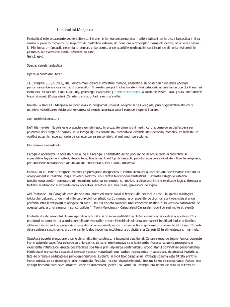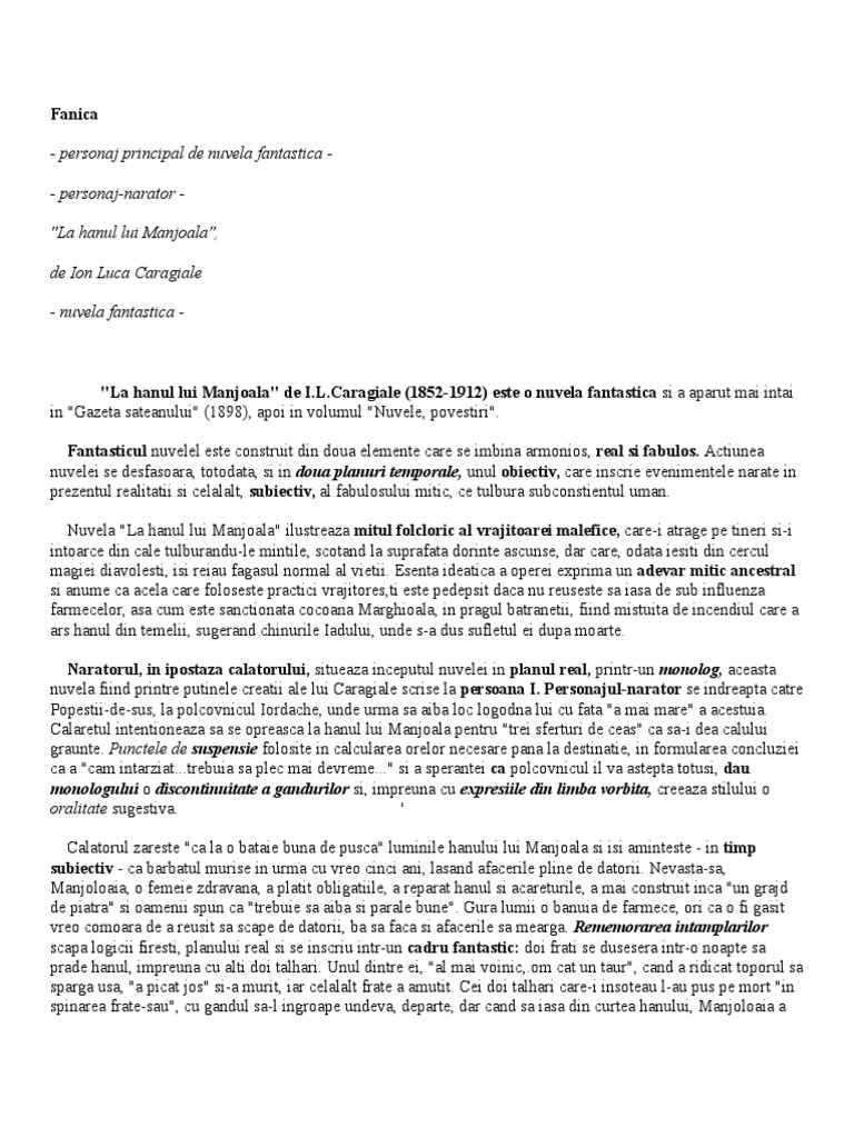 Referat despre la hanul lui manjoala comentariu personajul principal tanarul fanica isi povesteste intamplarile intr o seara aspra de toamna cu vreme in schimbare atmosfera este a hanurilor traditionale argatul ia calul vizitatorului in primire si il duce in grajd in carciuma sunt oameni multi si canta doi tigani somnorosi unul cu lauta si altul cu cobza in schimb cucoana. In nuvela la hanul lui manjoala fantasticul apare ca o ruptura in ordinea fireasca a intamplarii si implica prezenta diavolului cu care hangita avea legaturi. Odaia fara icoane usa care se tranteste atunci cand drumetul isi face cruce si in cendiul final fac din han un spatiu apartinand infernului si pro tejat de satana. Actiunea nuvelelor se desfasoara scenic dialogat scriitorul urmarind reactiile eroului doua loturi care sub povara banului suporta un dezechilibru psihic evoluand de la rasul pesimist la violenta si stare de nebunie nuvela fantastica calul dracului la hanul lui manjoala kir ianulea.