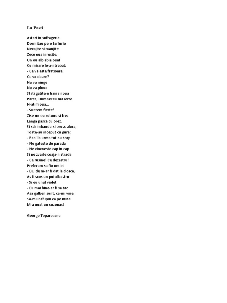 Un ou alb abia ouat cu mirare le a ntrebat. La paști de george topârceanu rezolvă testul la paști de george topârceanu pe platforma educațională kidibot. De george topârceanu george toparceanu 2006 03 22 înscris în bibliotecă de mihai miro. Home la pasti de george toparceanu.