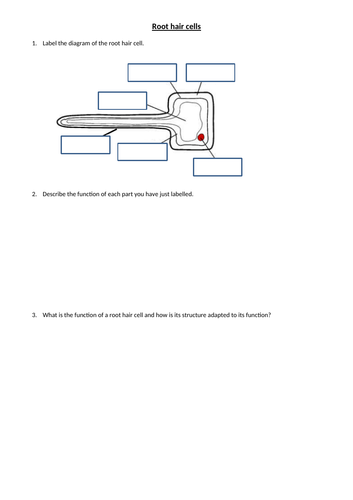 The structure of a root hair cell differs from other root cells in that it has a long thin extension supported by the central vacuole which greatly increases its surface area. The root hair cells are delicate structures on the root of a plant which live only two to three weeks. It absorbs water and is a plant cell the roots hair collect food from the soil. Used with edexcel gcse biology as an afl resource can be used with ks3 students too.