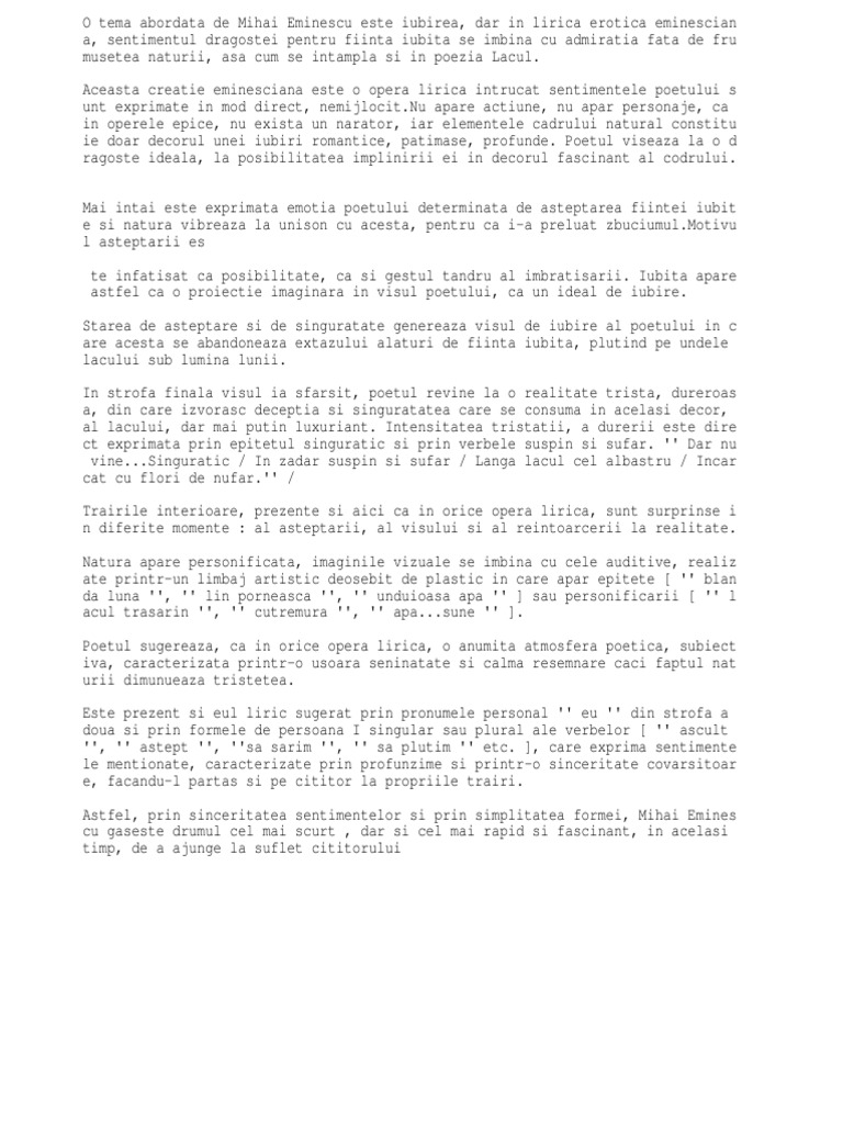 Eminescu lacul comentariu literar. Iubita este aşadar ea unică singura care ar putea să l facă fericit. Este capodopera eminesciană o admirabilă sinteză a temelor şi motivelor atitudinilor poetice eminesciene. Ca specie lirică aceasta poate fi considerată un pastel cu elemente de idilă în care se îmbină sentimentul dragostei pentru fiinţa iubită cu admiraţia faţă de frumuseţile naturii.